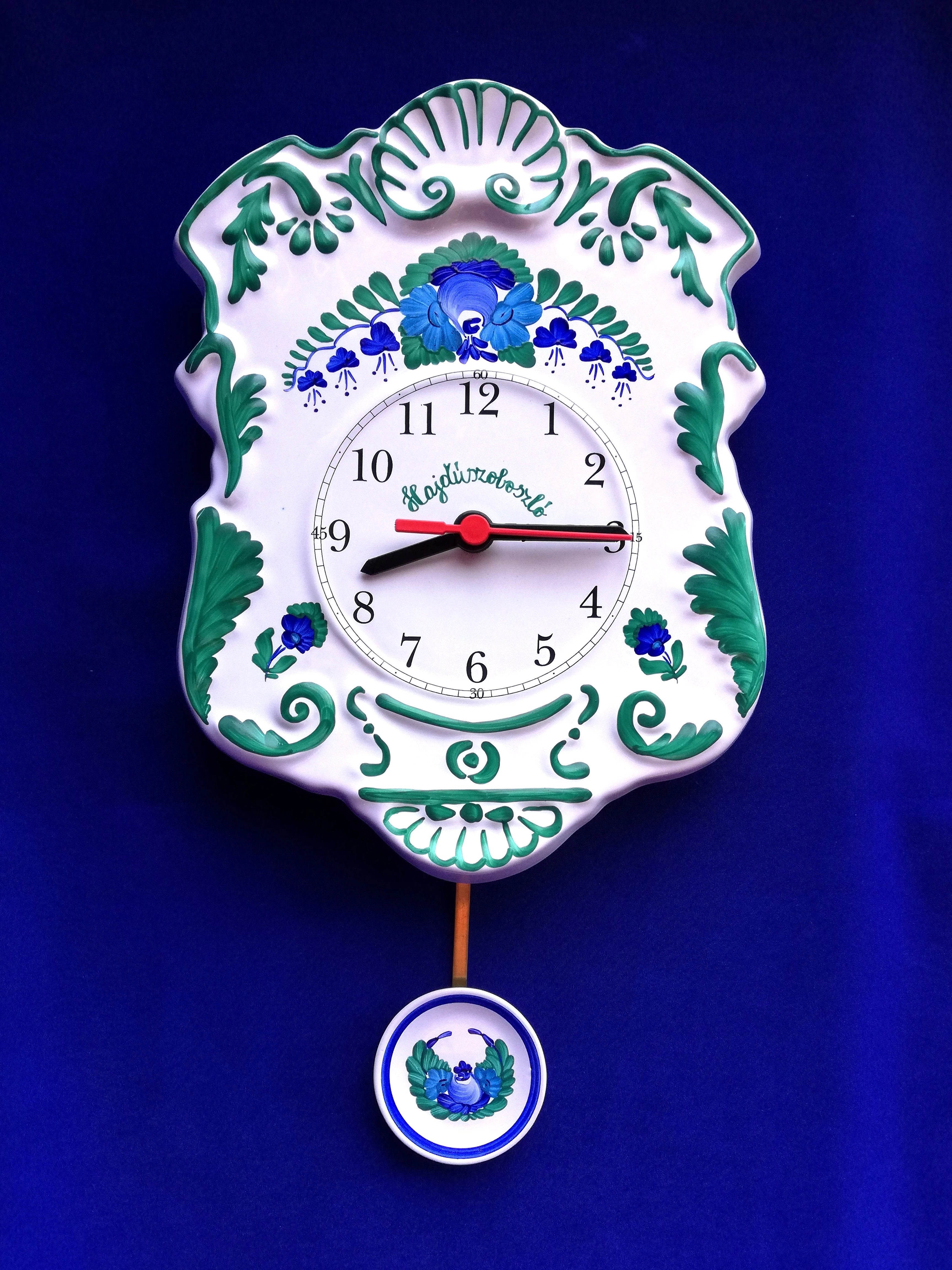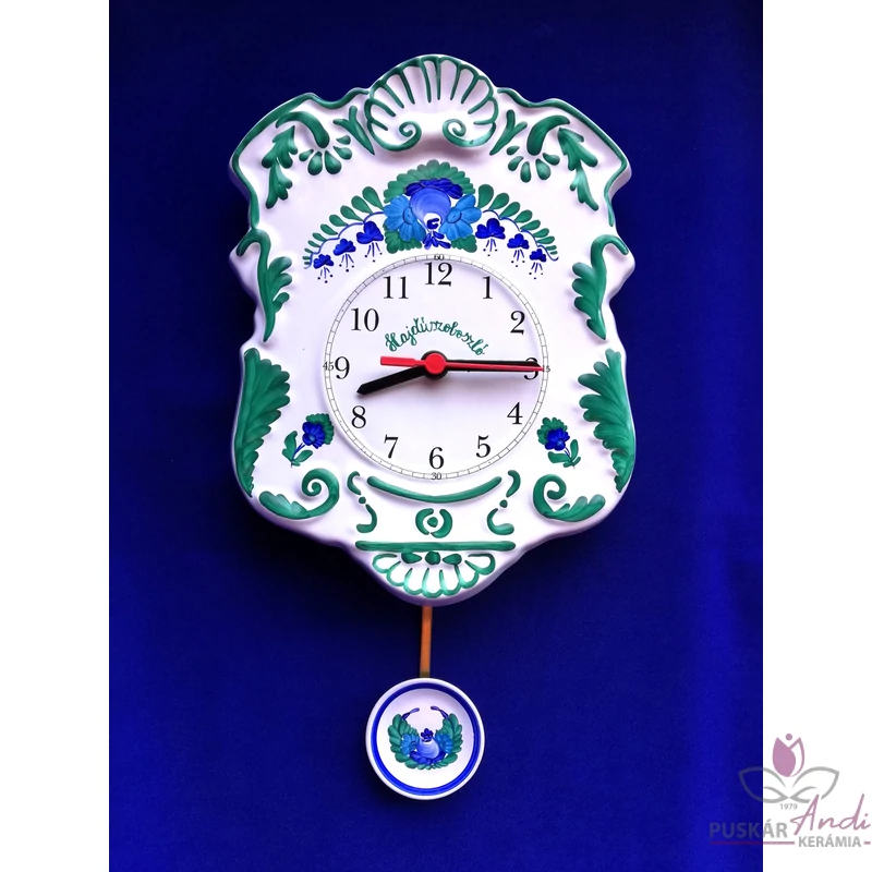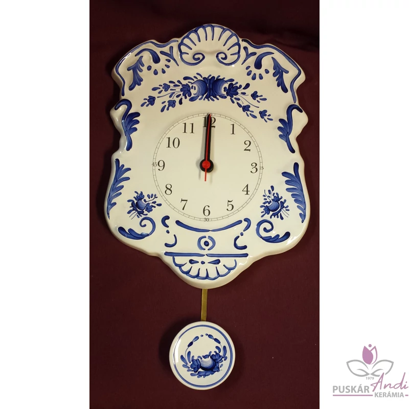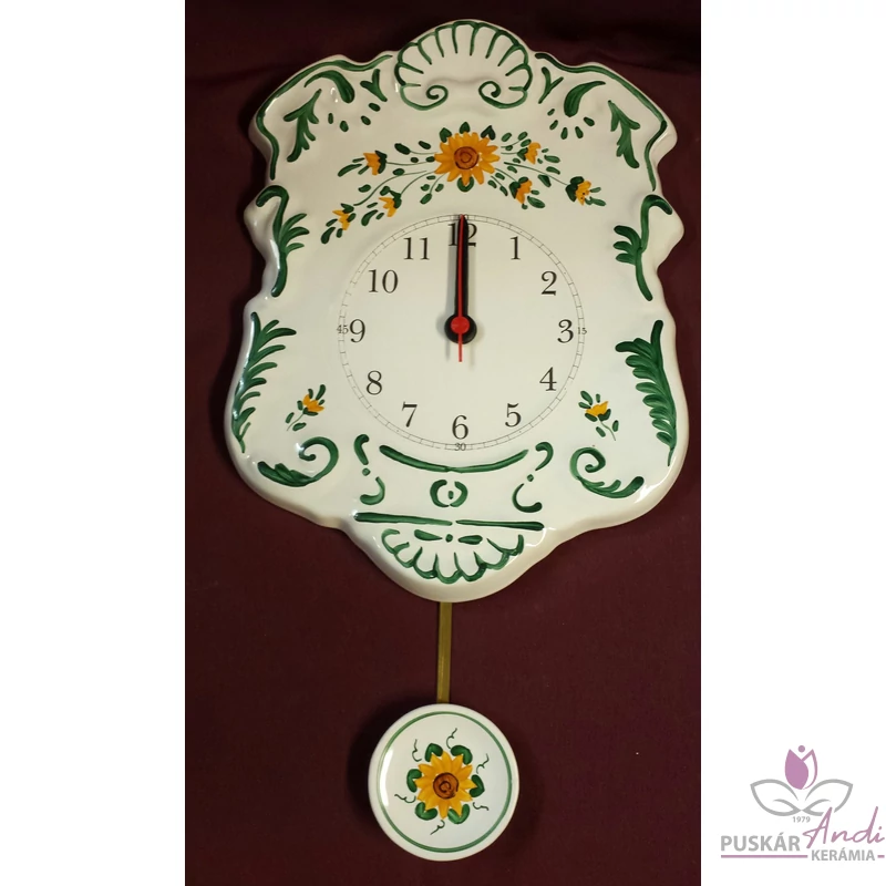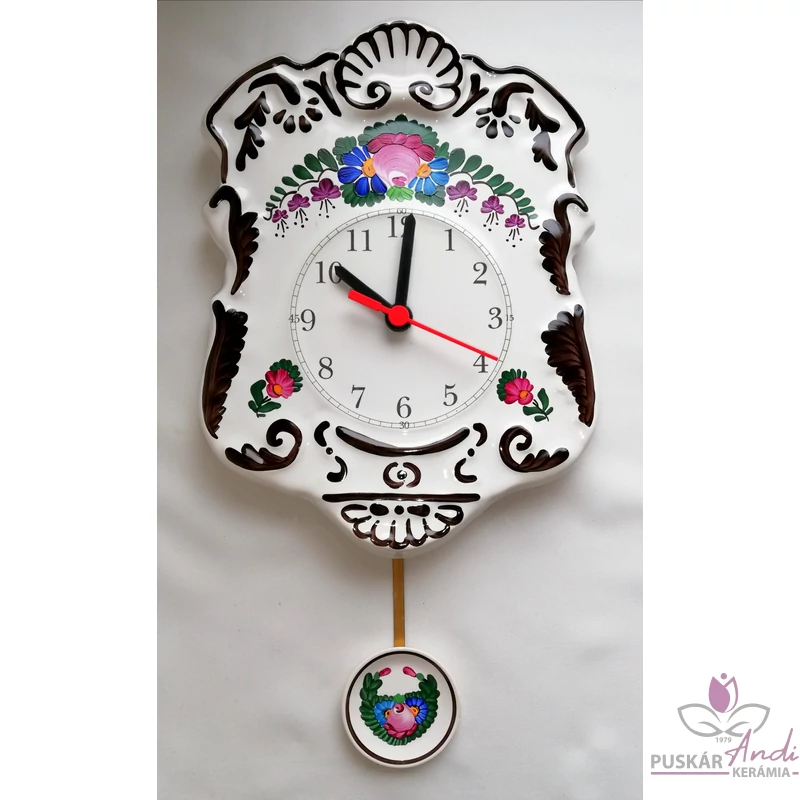 Kézi festésű, domború felületű, szépen díszített ingás fali kerámia óra. Nagyon kedvelt termékünk, dús díszítettsége miatt.