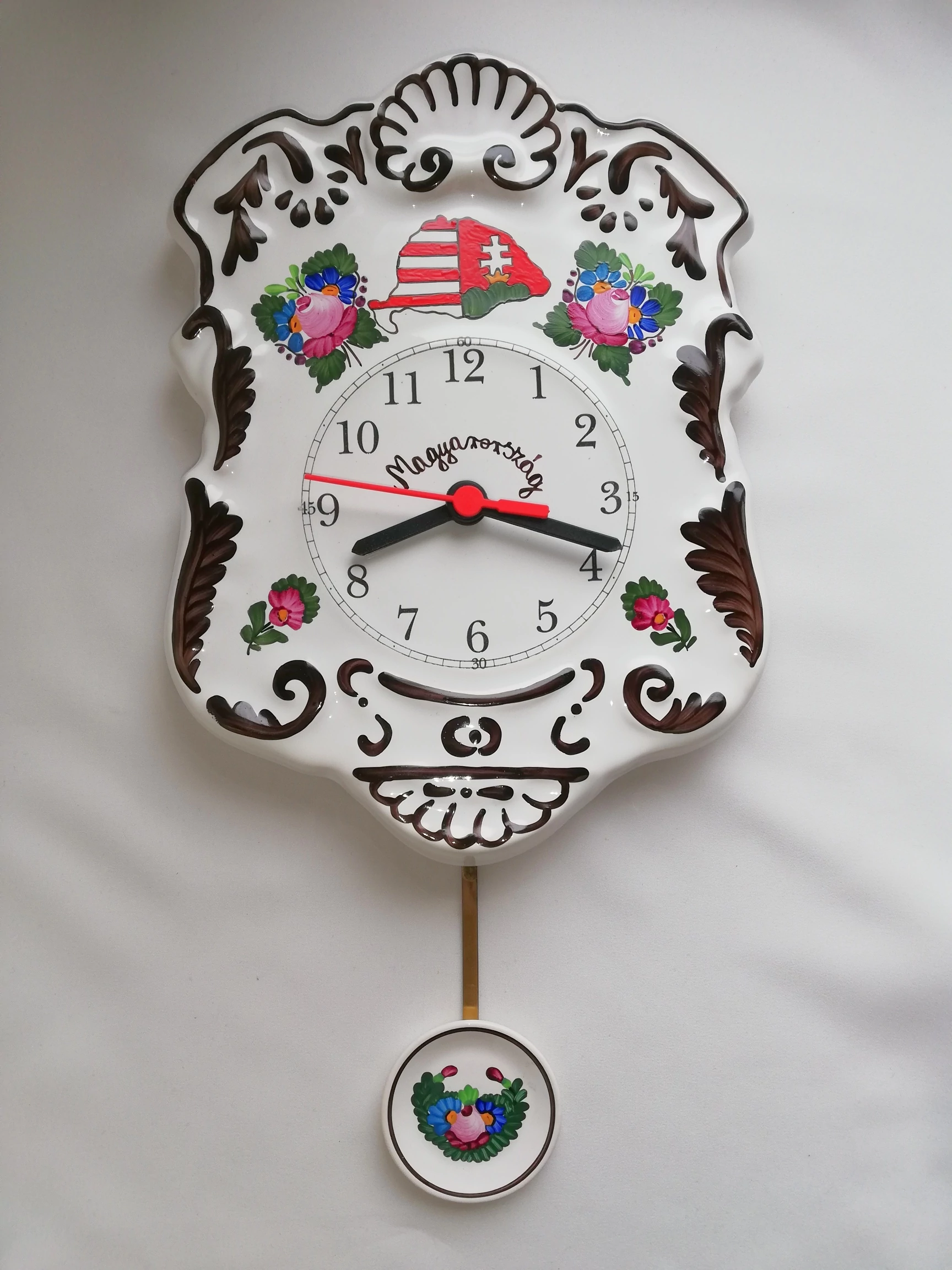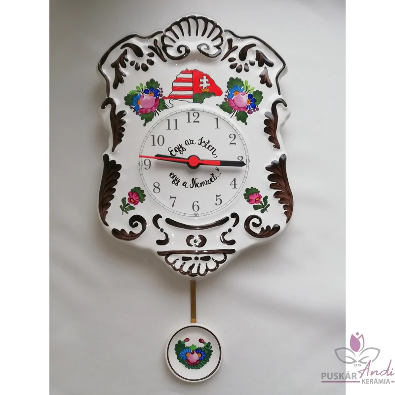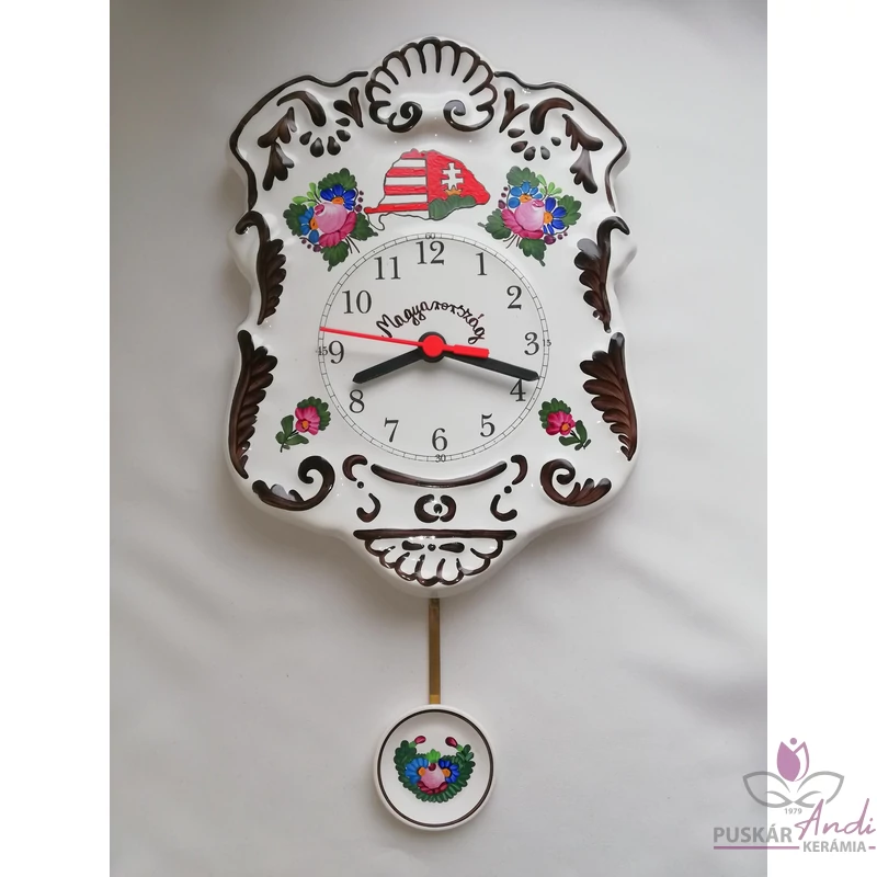 Kézi festésű, domború felületű, szépen díszített ingás fali kerámia óra, emblémával dekorálva. Nagyon kedvelt termékünk, dús díszítettsége miatt.