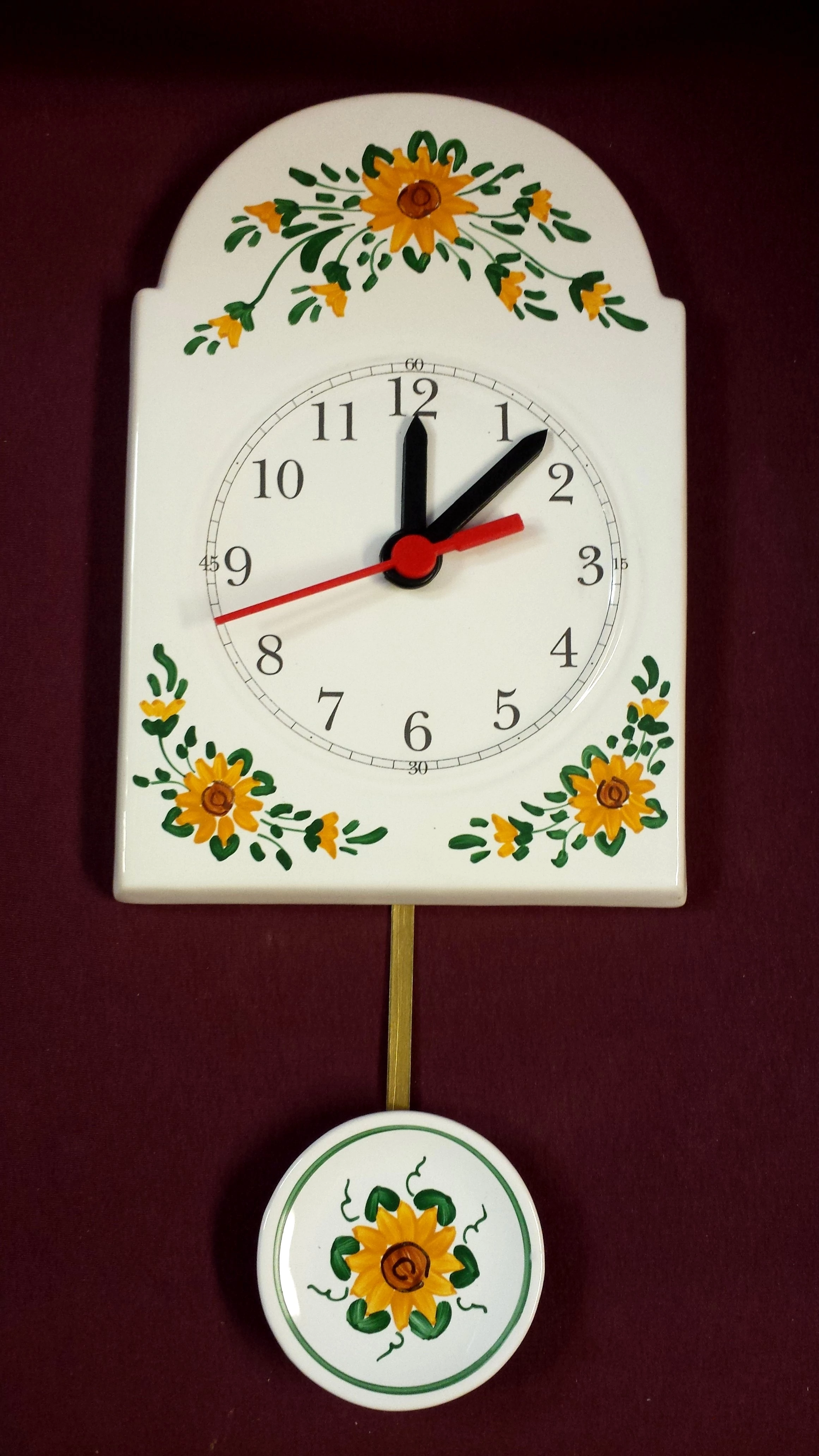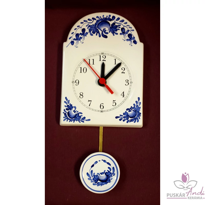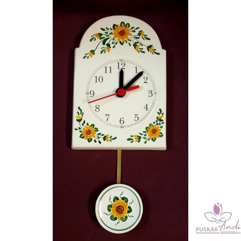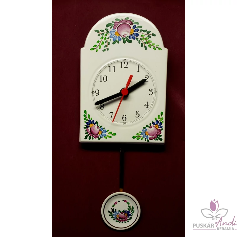 Kézi festésű, ívelt tetejű kerámia fali óra, ingás szerkezettel.