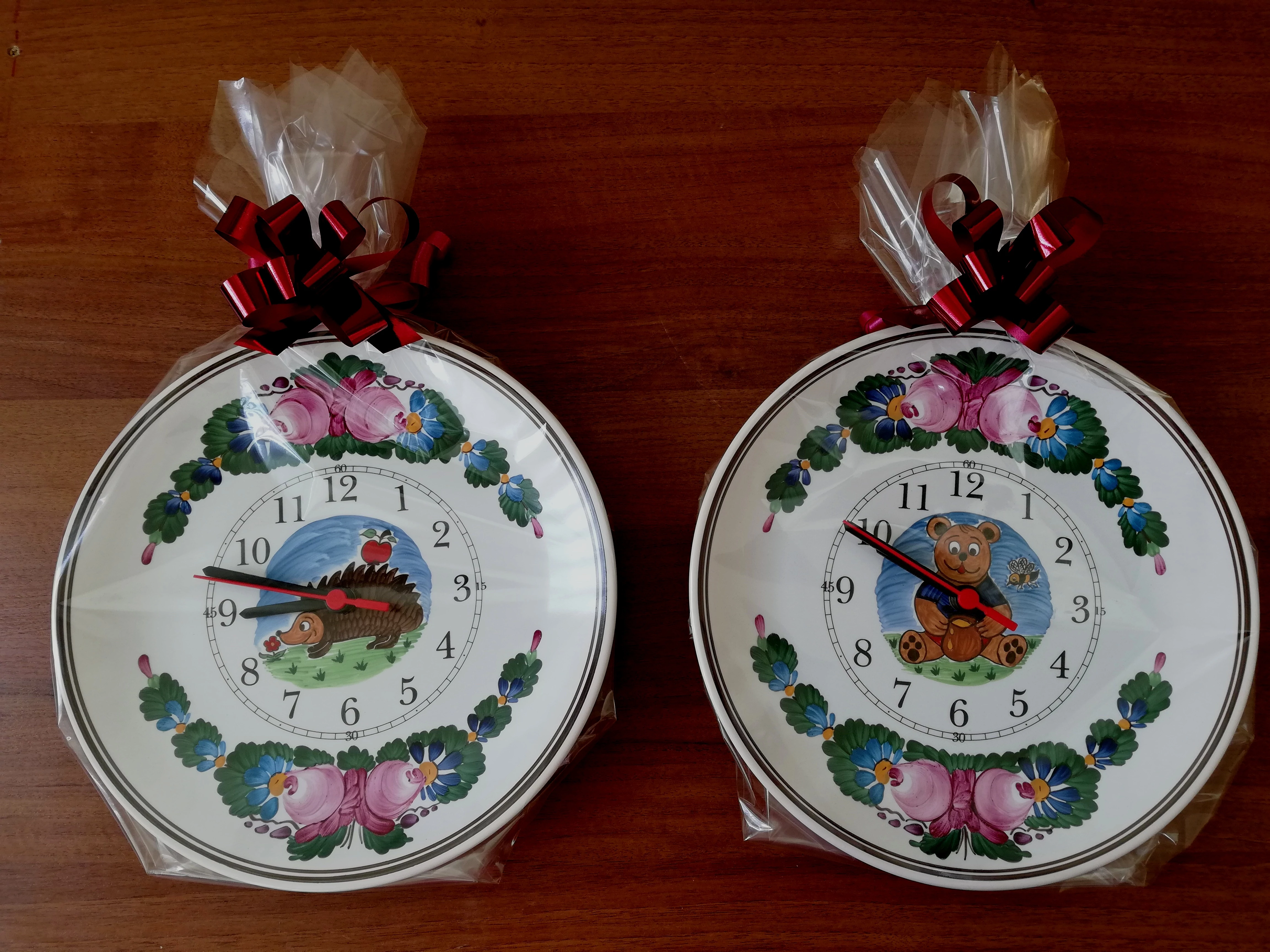 Ez a két óra bölcsis ballagásra készült, a 2 csoport jele van csak rajta és az óra hátuljára volt ráírva, hogy ki, kiktől és mikor kapták az ajándékot.