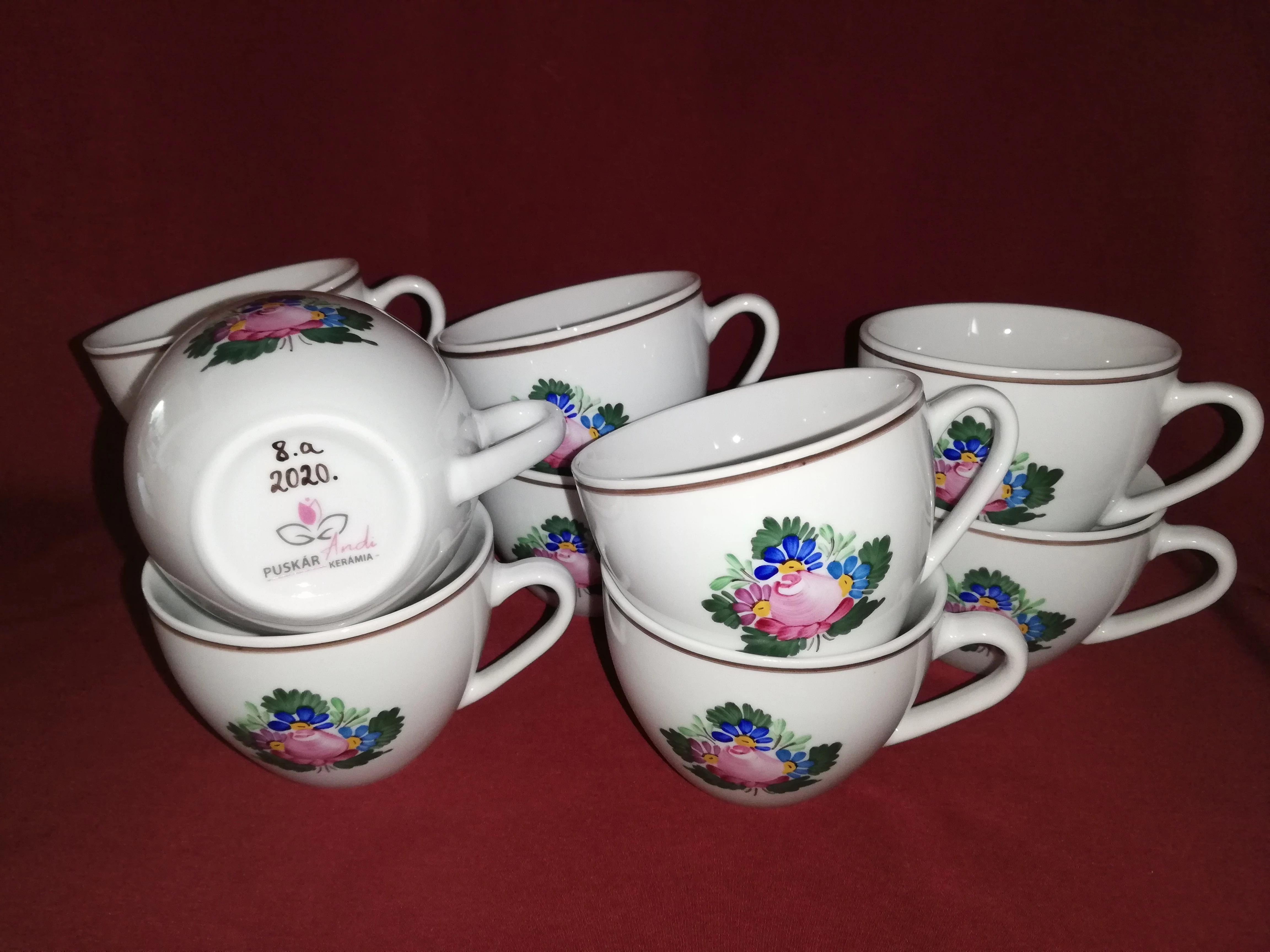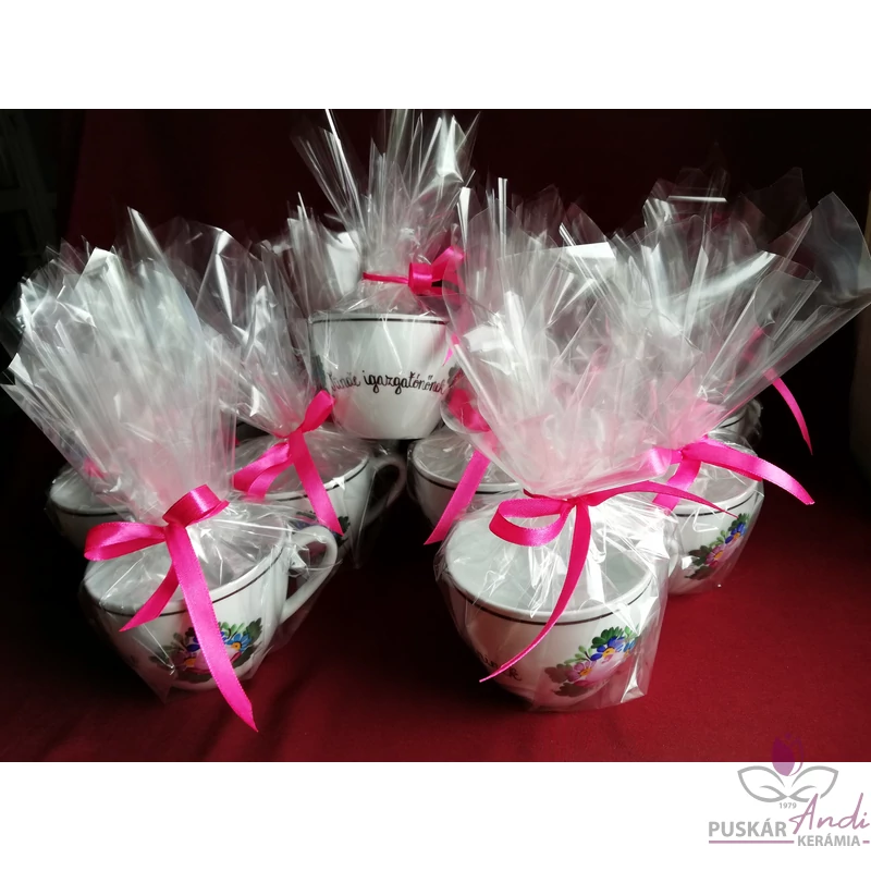 Ezt a 13 kis csészét a 8. osztályból ballagó gyerekek adták ajándékba, az őket addig tanító tanároknak és tanítóknak, köszönetképpen. /Nem saját termékünk, fehér mázas porcelánbögre az alap./